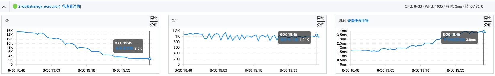 下图是从 (userId, graphId) 方案切换至 (userId) 方案时的生产环境数据库的监控截图,可以看到 QPS 随发布的显著下降,以及 RT 的上涨: